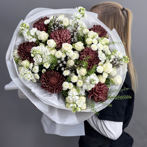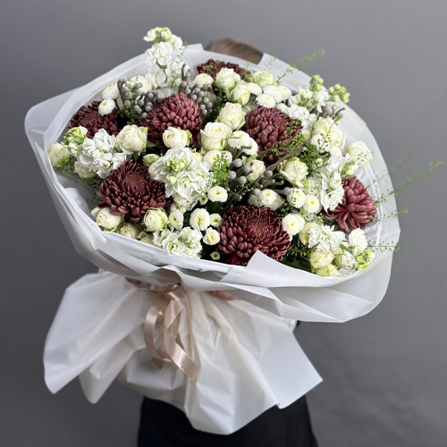 Букет "Шоколадный френч" из кустовых роз, хризантем Бигоуди, брунии, ароматных маттиол и сантини