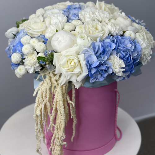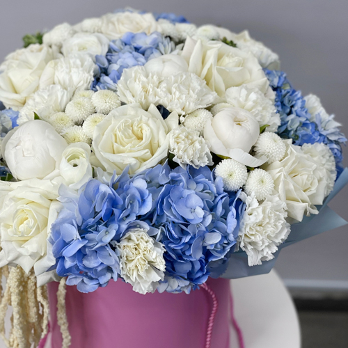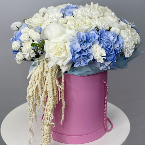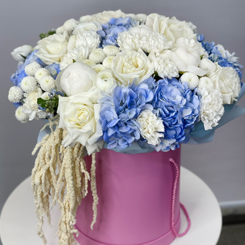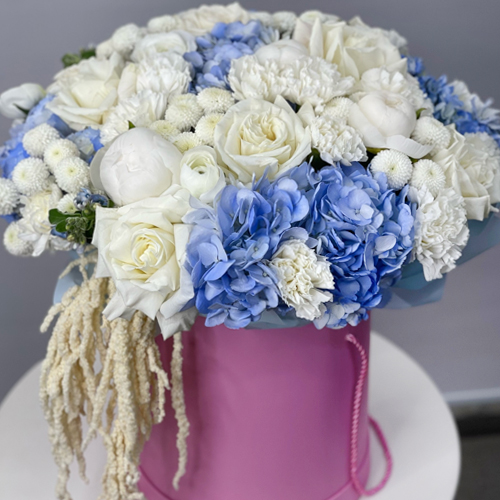 Композиция в шляпной коробке "Красотка" из пионов, гортензий, ранункулюсов, роз Эквадор, оксипеталума, диантусов и хризантем Ньютон