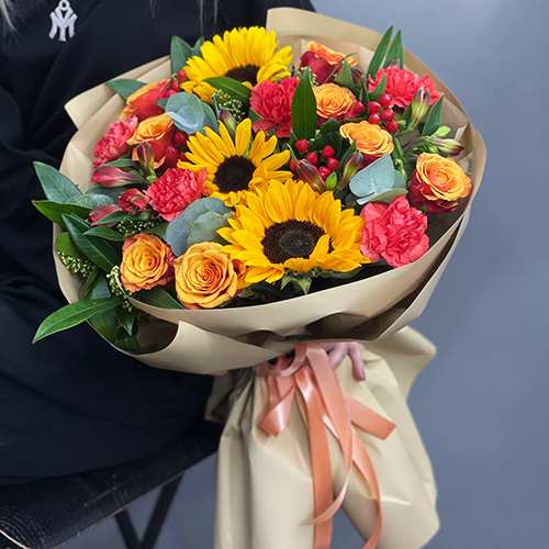 Букет "Ричи" из подсолнухов, альстромерий, гиперикума, роз, скиммии и диантусов