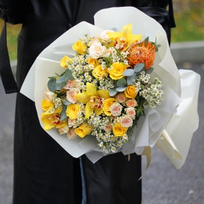 Букет "Пина колада" из лимонных роз, лейко, орхидей, хамелациума и ромашек